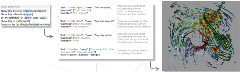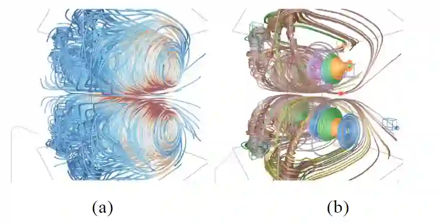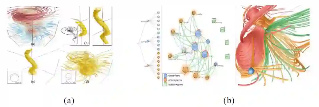 接下来,陶钧老师主要从(1)抽象空间如何有助于观察复杂的流结构并与之交互,(2)如何将新兴的交互技术应用于流可视化两个方面集中讨论了他们近期两个交互式流可视化相关研究工作。首先,针对复杂的流结构,分别介绍了基于模式(如图2(a)所示),以及基于语义(如图2(b)所示)的指定流结构获取方法。