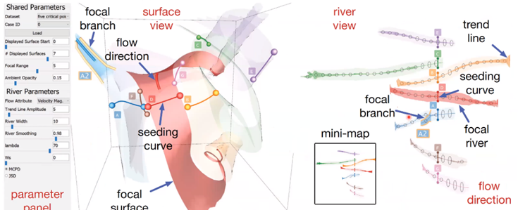 基于提取出的流结构,陶钧老师进一步结合他们的研究工作介绍了如何有效的对其进行可视化,减少视觉干扰,提高人类感知。针对流数据面可视化中自我遮挡严重以及缺少场线难以追踪起点和终点的挑战,陶钧老师介绍了一种新的视觉转换方法SurfRiver,可以将 3D 中的河流表面展平为 2D 中的河流,以进行比较可视化,如图4所示。这种可视化映射使用户可以轻松地沿流向跟踪并对齐流表面以进行比较研究。通过刷、连,将河景与空间面景连接起来,进行集体推理。
