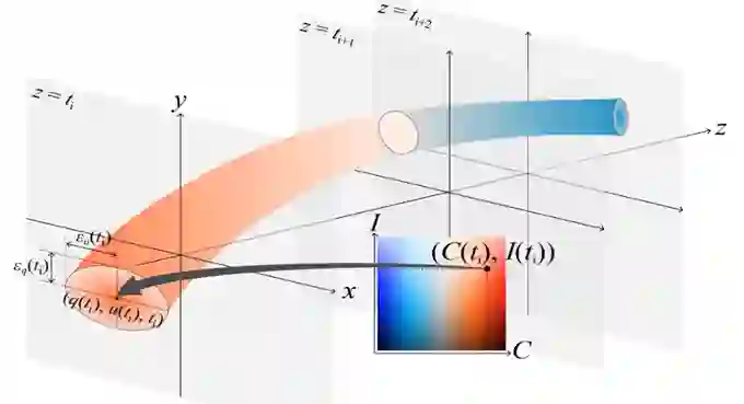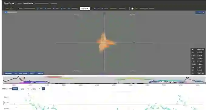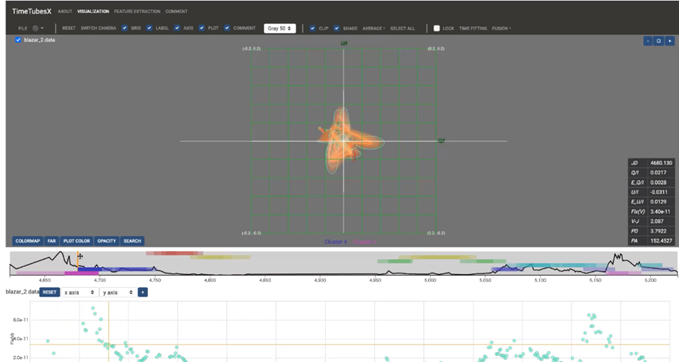 为观察耀变体,天文学家通常通过动画散点图分析偏振、强度和颜色的时间变化模式。此类方法通常难以进行Stokes平面上的时变分析以及理解变量之间的相关性,同时可视化结果视觉混乱,难以交互。对此,Naoko Sawada介绍了一种新的可视化方案,TimeTubes,用于探索在耀变体中观察到的极化时间序列数据。如图5 所示,在TimeTubes中,数据由 3D(Q、U 和时间)空间中的管表示。物体的Q和U、颜色和总通量的测量误差用管子的尺寸、颜色和亮度来表示。因此,TimeTubes允许我们在一个视图中查看六个变量的行为。