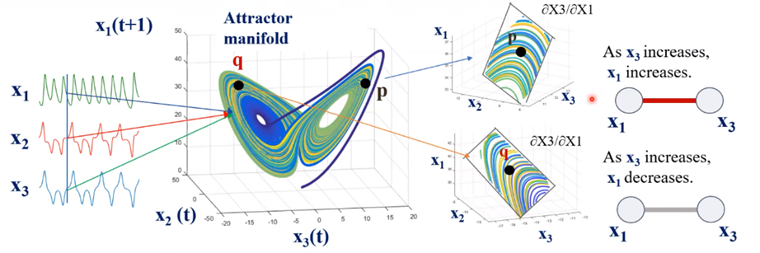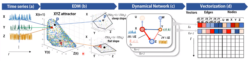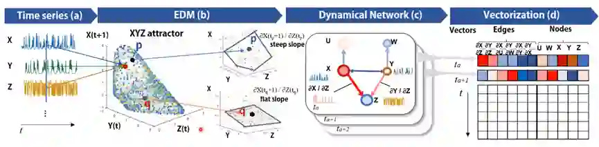 跨多个学科进行科学探究的一个重要方法是使用观察时间序列数据来了解关键变量之间的关系,从而获得对管理给定系统的基本规则的机械洞察力。在真实系统中,例如生态系统中,时间序列变量之间的关系通常不是静态的;相反,这些关系是动态的,并且以非线性或状态相关的方式变化。为了进一步了解此类系统,在Hiroaki Natsukawa的近期工作中研究了将适当表征这些动态的方法(即,测量随时间变化的系统状态变化时的交互的方法)与有助于分析系统行为的可视化技术相结合。如图14所示,专注于经验动态建模 (EDM) 作为一种最先进的方法,该方法专门识别因果变量并测量时间序列变量之间不断变化的状态相关关系。EDM 不是使用以参数方程为中心的方法,而是一种基于动态吸引子研究系统的无方程方法。最后,他提出了一个可视化分析系统,以支持使用 EDM 构建的动态图对系统状态进行识别和机械解释。