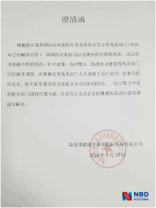 此外,记者从一名受害人处获悉,博鳌银丰康养国际医院给他们发来一份澄清函,称原医疗美容项目合作方青岛美泊门(2018年已经解除合作关系),欺瞒医院私自违法违规宣传宫颈癌疫苗,违法使用来路不明的疫苗。此事与医院无关。