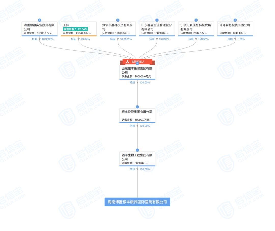记者在查询启信宝发现,多家公司通过多层结构持有博鳌银丰康养国际医院股权,直接股东是银丰生物工程集团。除了这家医院,该集团还在全国多地开设了干细胞工程、生物工程、医疗科技相关公司。