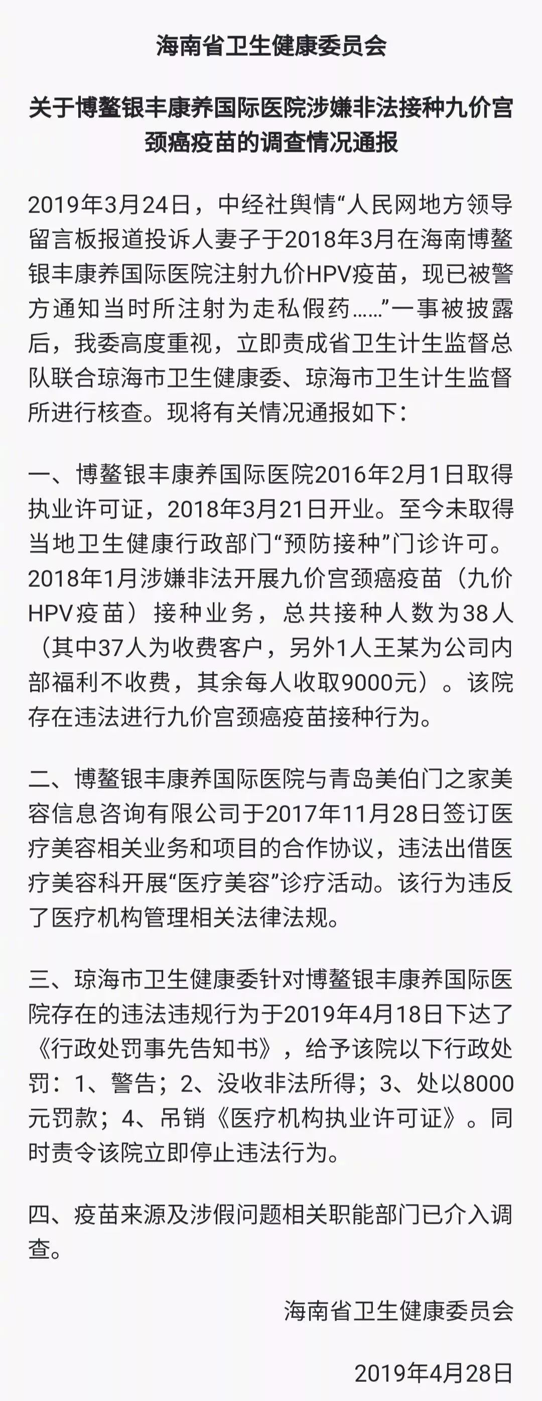4月28日,海南省卫生健康委员会通报博鳌银丰康养国际医院涉嫌非法接种九价宫颈癌疫苗的调查结果,明确该院存在违法进行九价宫颈癌疫苗接种行为。