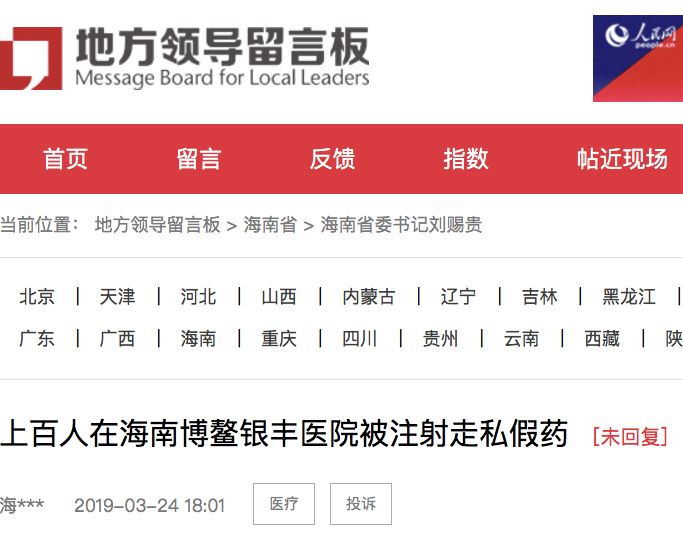 除了在人民网地方领导留言板上的举报,4月22日,还有微博网友@王曦Anna爆料,自己在海南博鳌银丰康养国际医院注射的九价HPV疫苗被认定为假疫苗。