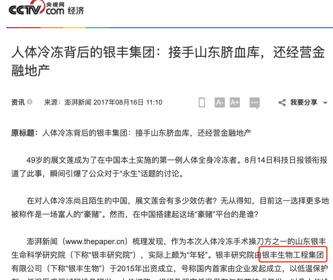 银丰生命科学研究院即银丰生物工程集团下属子公司。该研究院于2015年成立,号称国内首家由企业发起成立,以低温保护剂、低温医疗器械和设备研发、人体细胞、组织及器官低温保存与复苏技术开发,以及人体冷冻低温保存的专业研究机构。