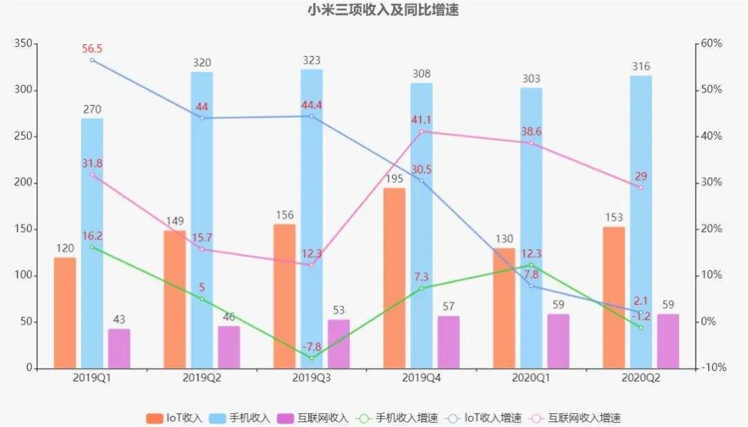 从财报上看,IoT与生活消费产品这项收入增速还是意料之中的持续放缓,收入是153亿元,同比增长的2.1%,依旧延续了上一季度的个位数增长。此外,疫情刺激线上流量逆向增长,不过小米这一季度来自互联网服务的收入环比上季度并没有增长,还是59亿元。