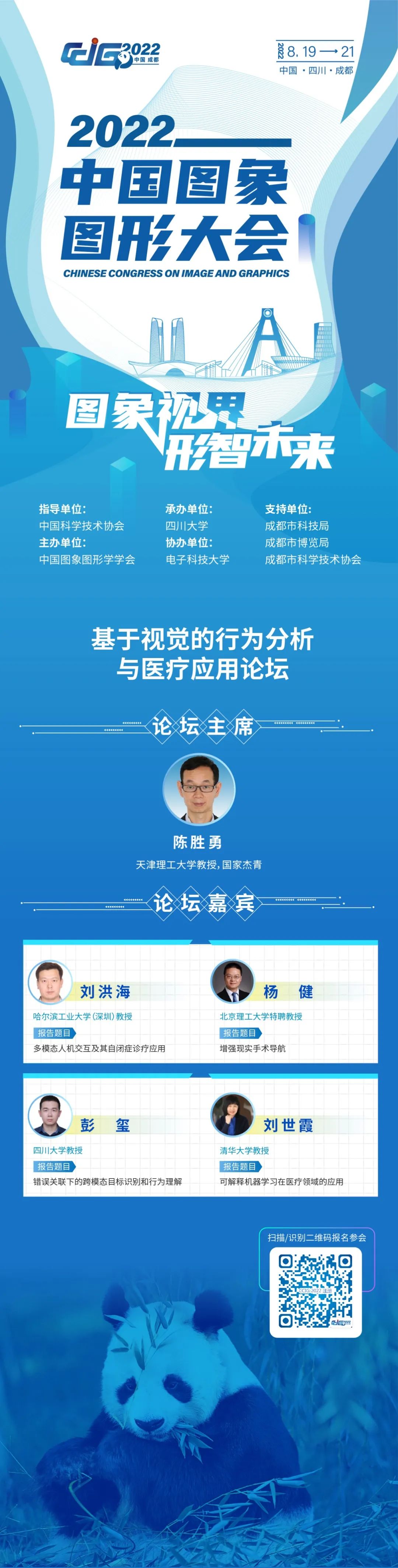 中国图象图形大会(CCIG 2022)将于2022年8月19-21日在成都盛大举办,大会以“图象视界,形智未来”为主题,由中国科学技术协会作为指导单位、中国图象图形学学会主办、四川大学承办、电子科技大学协办。