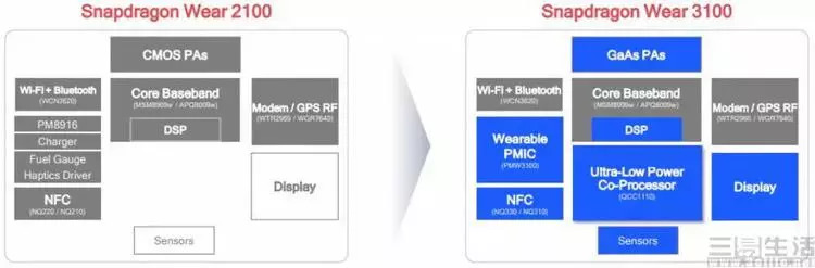 不过,在其他厂商看来,医疗似乎并非是智能手表唯一的“正确解答”,比如说高通就将“宝”押在了运动监测以及续航能力上,而且还特意“蹭”了一下苹果的热点(雾)。因为就在苹果召开发布会的前几天,高通正式发布了用于未来高端Android Wear智能手表的Snapdragon Wear 3100芯片。要知道,在此之前,高通已经有两年多的时间没有更新过旗下的智能手表芯片产品线了,上一代的Snapdragon Wear 2100使用的还是古老的32位Cortex A7架构……