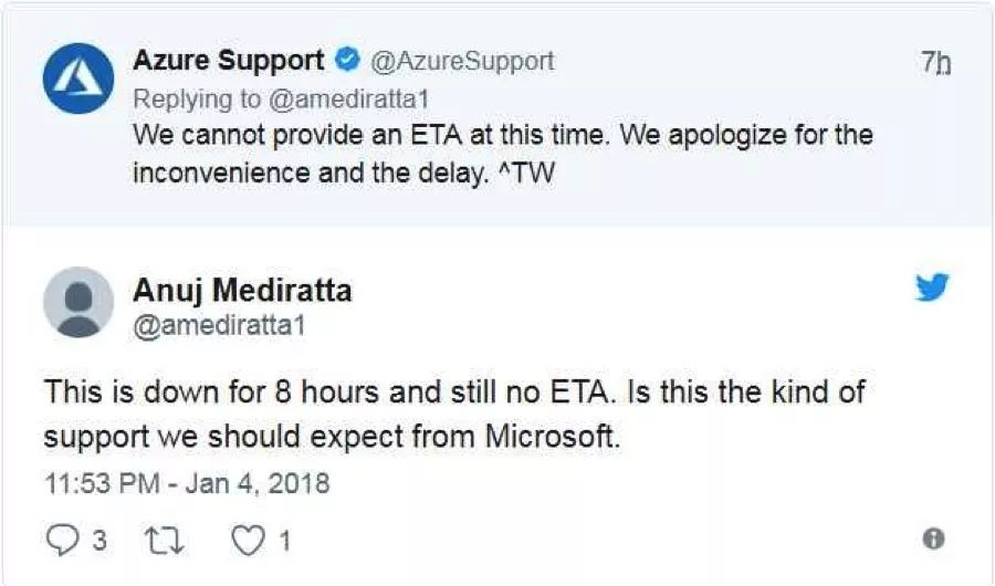 但最惨的恐怕还是修补漏洞打补丁结果还失败了,Azure 的 Virtual Machines 就在打上 Meltdown 补丁更新后然后瘫了~ 大量微软 Azure 客户纷纷在社交媒体上抱怨自己的虚拟机遇到了问题:在 1 月 5 日 的 Meltdown 补丁更新后,自己的虚拟机无法恢复正常运行。