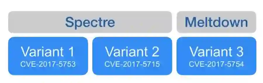 由 Meltdown 和 Spectre 这两个漏洞延伸出三个变体 Spectre Variant 1(CVE-2017-5753)、Spectre Variant 2 (CVE-2017-5715) 和 Meltdown Variant 3(CVE-2017-5754):