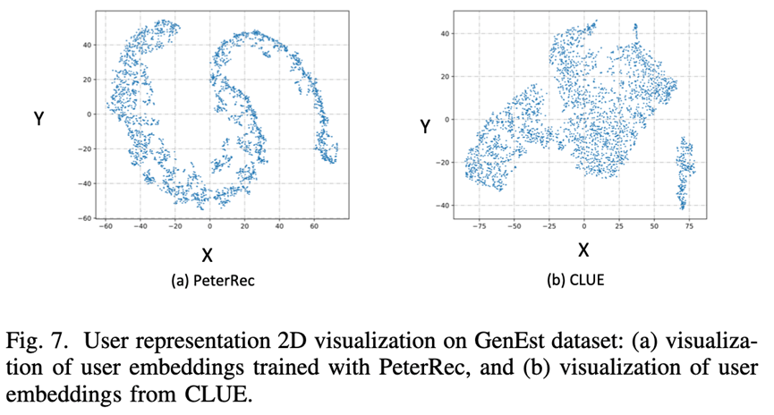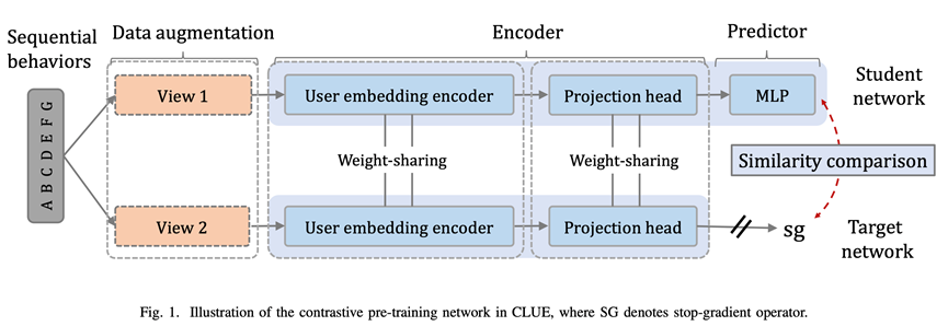 动机不多提了,很有意思的一点,这篇论文的名字也叫CLUE,与(8)相同,好像NLP里面也有这个名字,论文也是探索性质,指出PeterRec这种基于item level的训练方式容易破坏用户表征,或者是一种次优的表征,既然是用户表征就应该基于user level,对用户行为直接做比较学习,论文尝试了常见的显式数据提升方式和隐式的dropout方式,证实方法的有效性。