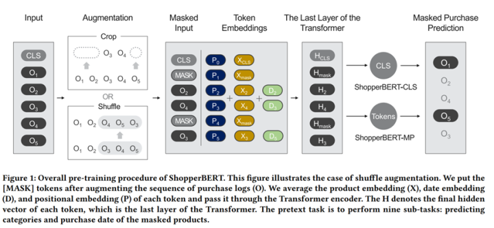论文动机也是认为学习general-purpose的表征能力在机器学习社区已经取得了很大的成功,同时指出在电商场景下,学习one4all的表征,可以用来做很多下游任务,例如用户画像预测、推送和推荐系统。为此,作者们系统的比较了电商场景下通用用户表征的建模方式和迁移效果,提出ShopperBERT模型,论文数据规模相当庞大,达到8亿点击行为(PeterRec数据接近1亿的行为),论文结果展示出预训练在多个下游任务上可以取得SOTA效果,该论文比较精彩的地方是做了非常广泛的分析实验,很有参考价值。