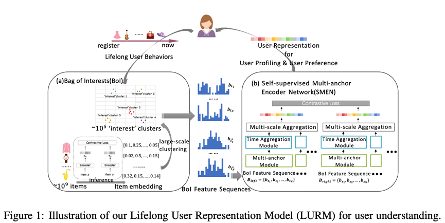 该论文也是提出了一种通用的用户表征终生学习机制,起名LURM,LURM包含了几个重要的组件(BoI和SMEN),通过比较学习学习用户通用表征能力,论文提出了首个具有建模lifelong行为序列的通用表征算法,论文还没读完,看起来比较干,论文呈现比较浓厚的阿里风格。不过看openreview审稿意见,论文本次被ICLR2022接受概率可能不太大,被指出实验部分缺少一些近期相关baselines的比较(如PTUM和PeterRec),其他评论意见不在此罗列,感兴趣的也可以参考openreview官网学习。整体上讲,论文水平感觉还是挺不错的,做了一些有意义的探索,值得学习。