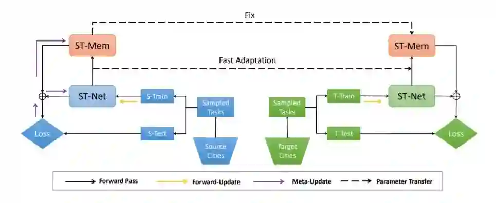 时空预测是构建智能城市的基础问题,对于交通控制、出租车调度、环境政策制定等任务具有重要意义。由于数据采集机制的原因,经常会出现空间分布不平衡的数据采集。例如,一些城市可能会发布多年的出租车数据,而另一些城市只发布几天的数据;有些区域可能有由传感器监测的恒定水质数据,而有些区域只有少量的水样。在本文中,我们解决了数据采集周期较短的城市时空预测问题。我们的目标是通过迁移学习利用其他城市的长期数据。不同于以往将知识从单一来源城市转移到目标城市的研究,我们是第一个利用多个城市的信息来增加转移的稳定性。具体地说,我们提出的模型被设计成一个具有元学习范式的时空网络。元学习范式学习时空网络的广义初始化,能够有效地适应目标城市。此外,还设计了一种基于模式的时空记忆,用于提取长期的时间信息。,周期性)。我们对两项任务进行了广泛的实验:交通(出租车和自行车)预测和水质预测。实验结果表明,该模型在多个竞争基准模型上的有效性。