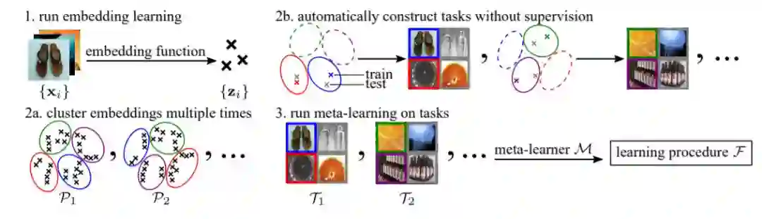 无监督学习的一个核心目标是从无标记数据或经验中获取表示,这些数据或经验可用于从少量标记数据中更有效地学习下游任务。以前的许多无监督学习工作都是通过开发基于重构、解缠、预测和其他度量的代理目标来实现的。相反,我们开发了一种无监督元学习方法,它显式地优化了从少量数据学习各种任务的能力。为此,我们以自动的方式从未标记的数据构造任务,并在构造的任务上运行元学习。令人惊讶的是,我们发现,当与元学习集成时,相对简单的任务构建机制,例如集群嵌入,可以在各种下游的、由人类指定的任务上获得良好的性能。我们对四个图像数据集的实验表明,我们的无监督元学习方法获得了一种没有任何标记数据的学习算法,适用于广泛的下游分类任务,改进了之前四种无监督学习方法学习的嵌入。