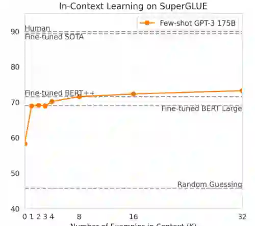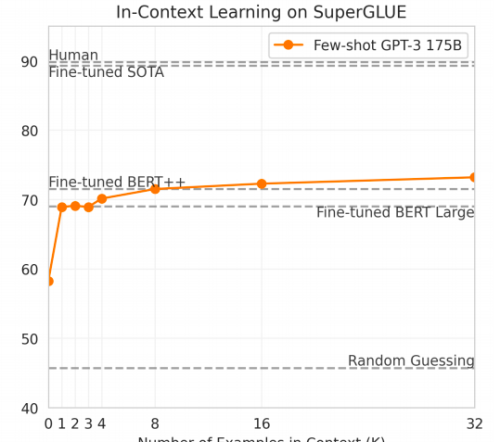 一个任务示例的表现要好于零个示例(GPT-2 论文就是零),但示例数量继续增长下去就没什么效果了;显然这里 " 越大越好 " 的理论没怎么生效。
