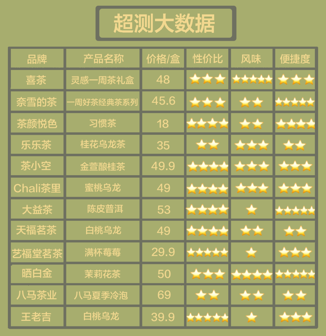 为了给大家更好地拔草,我们从去年天猫双十一销售前10、和新消费热门国产品牌中精选了以下12个国货品牌,分别是风头很大的新消费品牌喜茶、奈雪的茶、茶颜悦色、乐乐茶、茶小空、Chali茶里,以及屹立多年的传统国货老牌大益茶、八马茶业、天福茗茶、艺福堂茗茶、晒白金,甚至还有国民品牌王老吉!
