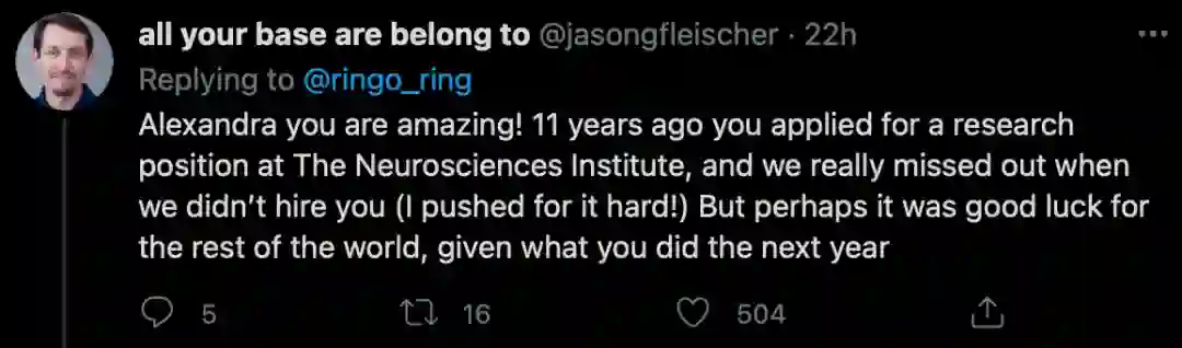 一位曾经没能录用Alexandra的研究人员表示,也许这对世界其他地方来说是个好运气。