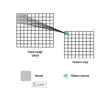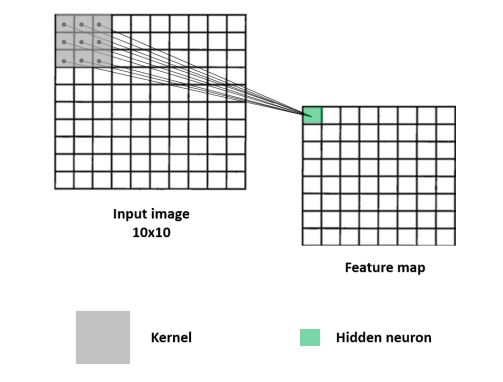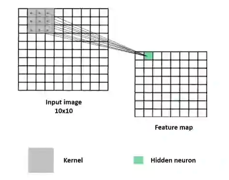 在该图中,第一层隐藏层的第一个神经元和输入层3x3像素区相连接。输入层到隐藏层的这种映射叫做特征映射(Feature map)。这个隐藏层神经元只依赖于3x3这一小片区域,也最终会通过学习来捕获这片区域的特征。