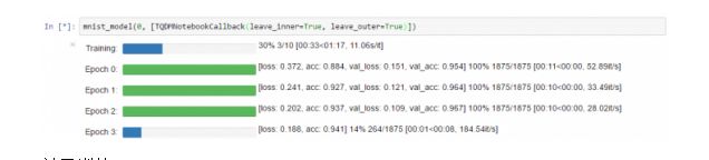 你需要做的事情很简单,就是在keras_tqdm上下载TQDMNotebookCallback,然后把它当作第三个回调函数。