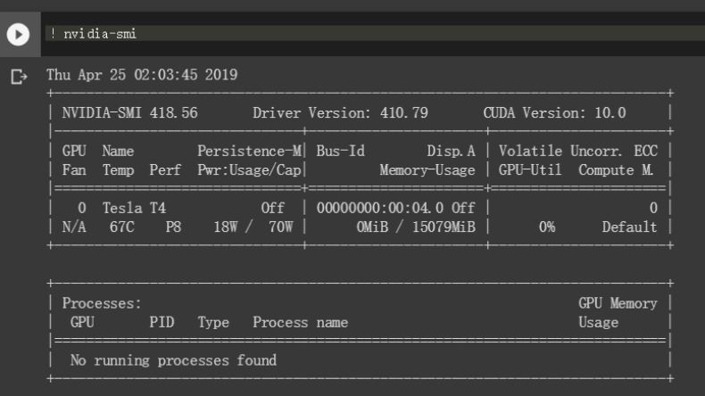 看到这条信息,小编也是挺激动的,终于有了更强大的免费算力,我们马上在 Colab 上查看 GPU 的使用情况。如下我们看到 Colab 现在确实使用的是 Tesla T4 GPU,而且显存也达到了 16 GB,比以前 K80 12GB 的显存又要大了一圈。