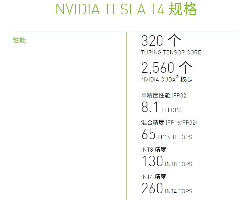 如下展示了 T4 和 V100 之间的差别,T4 支持多精度加速,确实非常适合做推理,以后将预训练模型放在 Colab 上也是极好的。