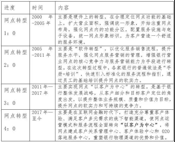 中国银行网点转型的前三个阶段都属于内视型改革,主要关注的是银行自身软硬件服务能力和竞争力的提升,关注的是网点自身业态与功能的调整。网点转型4.0版本属于外视型改革,主要围绕客户习惯与客户体验,倒逼银行物理渠道的进一步转型与升级。