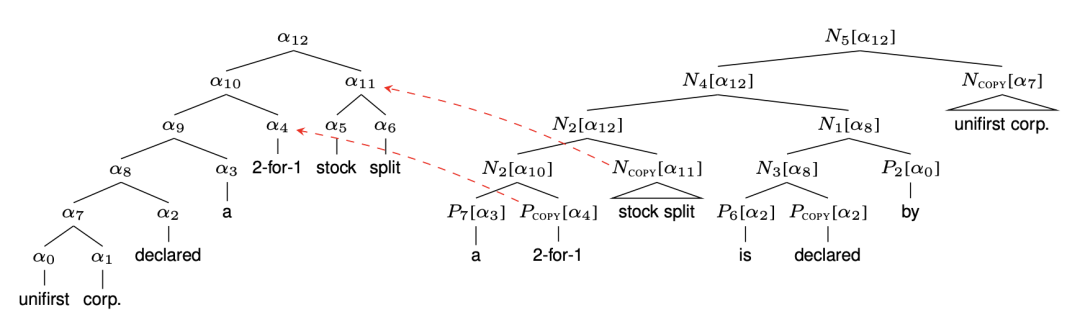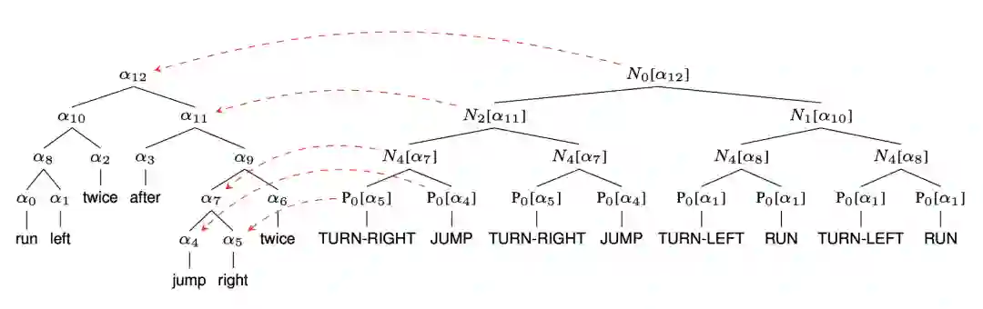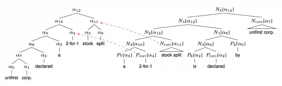 作者探索了使用潜在神经语法进行序列到序列学习的另一种分层方法。首先,使用准同步上下文无关语法(quasi-synchronous context-free grammars, QCFG) 对目标序列上的分布进行建模,该语法假设一个分层生成过程,其中目标树中的每个节点都被源树中的节点转换。这种节点级对齐为每个输出部分的生成方式提供了出处和因果机制,从而使生成过程更具可解释性。