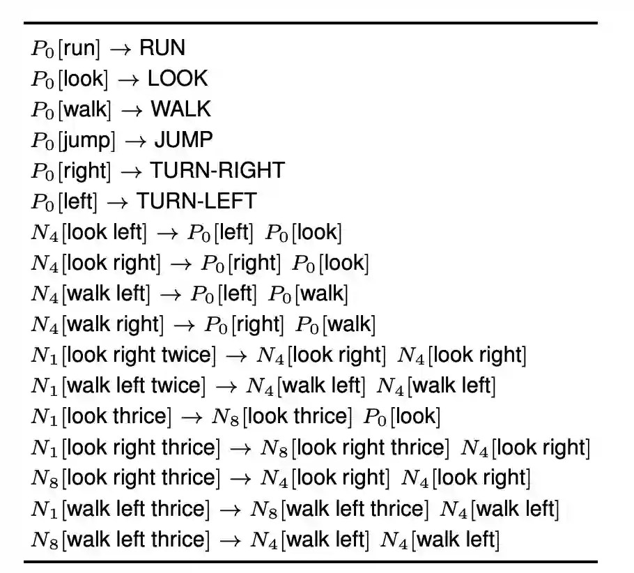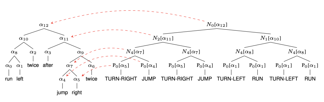 下图展示了从 SCAN 的添加原语(跳转)拆分的测试集上的神经 QCFG 生成的示例。从学习到的源解析器的诱导树显示在左侧,目标树推导显示在右侧。节点级对齐为每个目标跨度提供了明确的出处,从而使生成过程比标准注意力机制更易于解释。这些比对还可用于诊断和纠正系统错误。