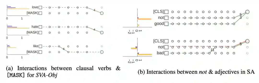 图中展示的是 SVA 任务实例的 BERT 架构(左)和 transformer 层的细节(右),用于评估模型是否选择了正确的动词形式,以供 [MASK] 与主题一致 。模式的示例用红色节点突出显示。