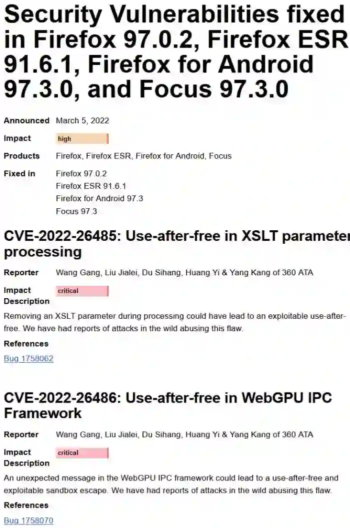 Mozilla今天发布了Firefox 97.0.2。这个“计划外更新”并不包含任何功能,但修补了两个被列为“关键”的安全漏洞。用户必须紧急应用该更新,因为Mozilla已经确认这两个安全漏洞正在被积极利用。