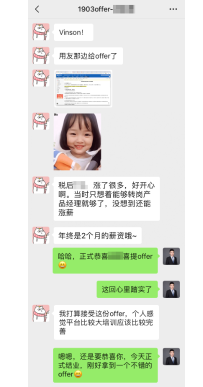 爱学习的人运气都不会太差,最终,在特训营的内推下,Joyce同学在10周特训结束的那一天就拿到了用友的产品经理offer。