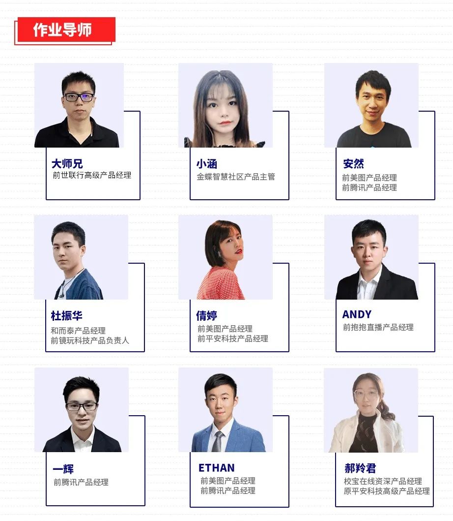 导师团均来自一线互联网大厂,他们久经打磨,专业知识过硬,同时洞察行业与市场,能带领你跟上行业趋势,学到的知识不过时。