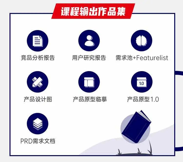 课程设置包含市场/竞品分析、用户研究、需求分析、产品设计、原型设计、交互设计、PRD撰写、产品上线管理等初级产品经理必备知识技能:
