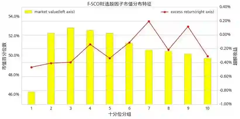 我们看到,因子倾向于中市值暴露,因子值最小的股票市值也比较小,而因子值在二分位到五分位的股票则倾向于大市值,中市值公司的F-SCORE因子值较大。