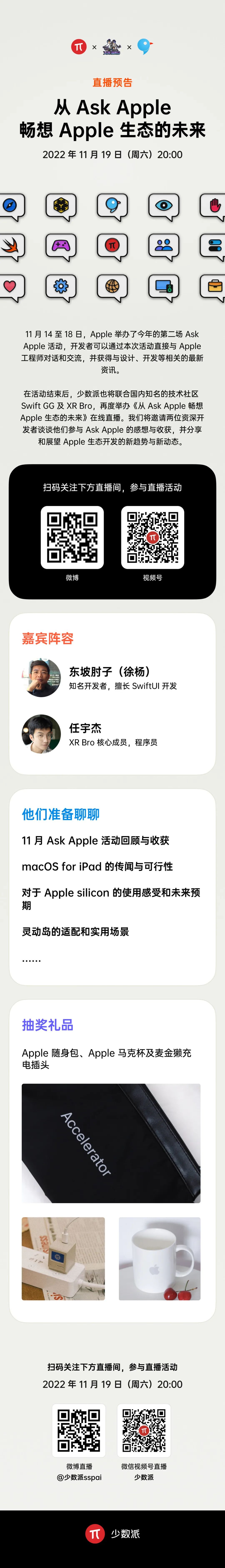 在活动结束后,少数派也将联合国内知名的技术社区 Swift GG 及 XR Bro ,共同举办《从 Ask Apple 畅想 Apple 生态的未来》在线直播。我们将邀请两位资深开发者谈谈他们参与 Ask Apple 的感想与收