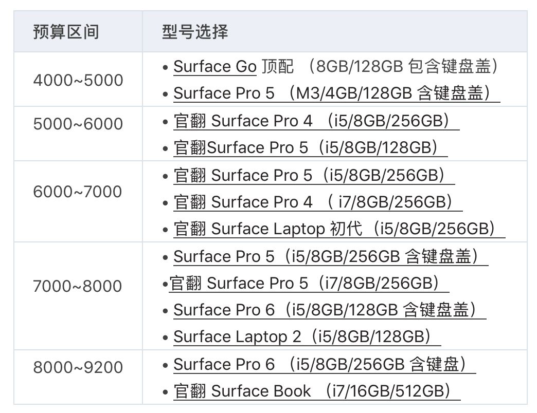 最后,为了方便大家选购,我特地整理了一张不同价位内的 Surface 选购表格供大家参考。表格中会纳入一些官翻机器,价格均参考自微软官方商城的价格。(官翻机器与新机均享受 2 年保修以及 30 天退换货服务)