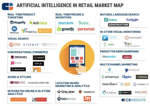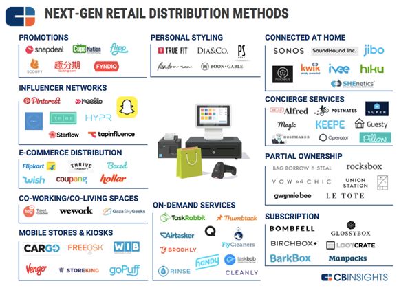 2017年,CB Insights发布了一份前沿零售科技报告,展现了人工智能、AR/VR、仓储科技和渠道分销等技术驱动的零售业的变革发展趋势。