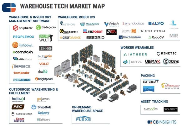 CBinsights将这一领域细分为仓储和库存管理软件、仓储机器人、工业可穿戴设备、包装机器人、货物跟踪、共享仓储和仓储外包。