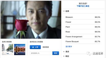 由于图片的内容辨识度更高,我们看到识别结果包括花、植物、玫瑰等不同的关键词,而且在置信度上也有一个比较高的分数。