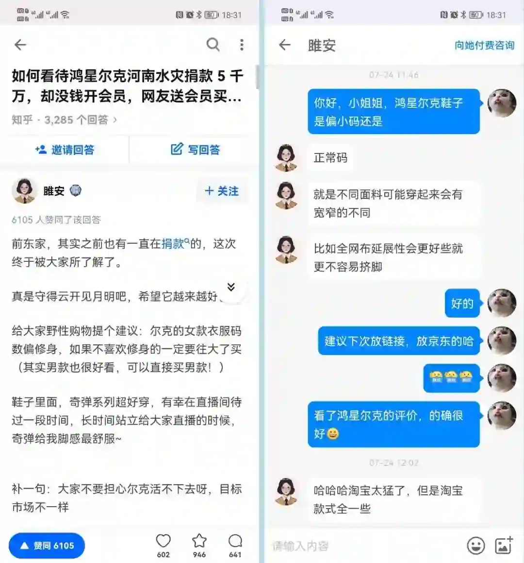 比如我当时看了知乎网友雎安对鸿星尔克及其鞋子的评价,让我产生了购买鸿星尔克鞋子的想法,但担心鞋子尺码买大了,所以就私聊她问清楚。在这个过程中,与内容建立联系是主线任务,而与人联系是打辅助。