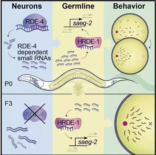 换句话说,没有产生小RNA的线虫会在食物识别上存在缺陷。当研究人员恢复在神经元中产生小RNA的能力时,线虫再次具备了高效觅食的能力。尽管线虫后代本身不具有产生小RNA的能力,但这种效果仍保持了数代之久。