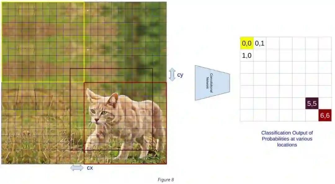 然后,我们裁剪包含在框中的块,并将它们调整为卷积神经网络的输入大小。 接着,我们将这些块送入网络以获取目标对象的标签。 我们用较小的窗口大小重复这个过程,以便能够捕捉较小尺寸的对象。 所以这个想法是,如果图像中存在一个对象,我们将有一个适当包含对象的窗口,并可以生成对应于该对象的标签。 这里是一个动态图,显示了在图像上运行的滑动窗口: