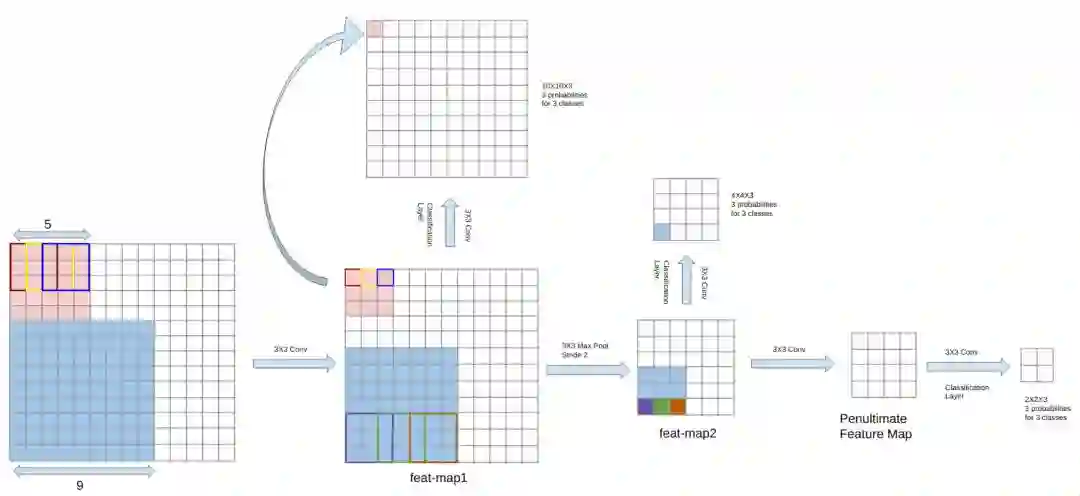 在我们的示例网络中,第一个特征图顶部的预测具有5X5的感受野大小(图9中的标记的特征图1)。它可以很容易地使用简单的计算。在图中已经用图解说明了。类似地,在特征图之上的预测考虑了9X9的块。所以我们可以看到,随着深度的增加,感受野的尺寸也在增加。