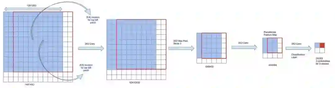 现在,我们将使用更大的图像来显示输入图像和特征图之间的直接映射。 让我们增加图像到14X14(图7)。 我们可以看到,左上象限(中心在6,6)的12X12块在倒数第二个特征图产生3×3的块(蓝色),最后在最终的特征图(蓝色)中得到1×1的分数。 位于右上象限(以红色显示,中心为8,6)的12X12大小的图像,其倒数第二个特征图相应地在最后一层产生1X1的得分(用红色标记)