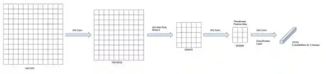 下面的图6显示了最初通过3个卷积层的尺寸为12X12的图像,每个卷积层具有3×3的滤波器尺寸(具有不同的步长和最大池化操作)。注意,在经过3个卷积层之后,我们得到一个大小为3×3×64的特征图,这个特征图被称为倒数第二个特征图,即应用在分类层之前的特征图。我们之所以这样命名,是因为我们会在后续内容中反复提及。在这个3X3特征图的基础上,我们应用了一个卷积核尺寸为3X3的卷积层。在这里使用三组这样的3X3滤波器来获得在网络末端输出的3个1X1的特征映射,其对应于三种类别的概率。