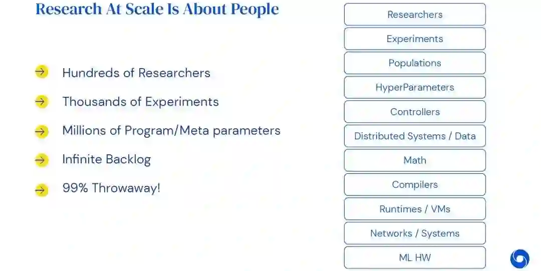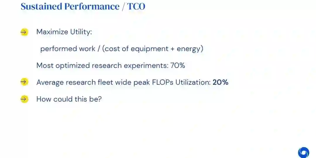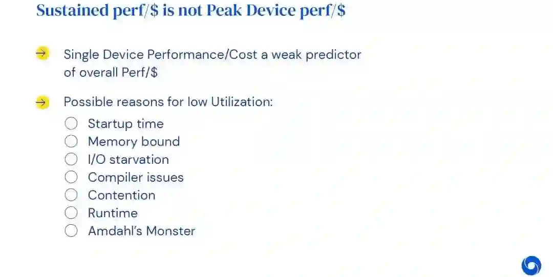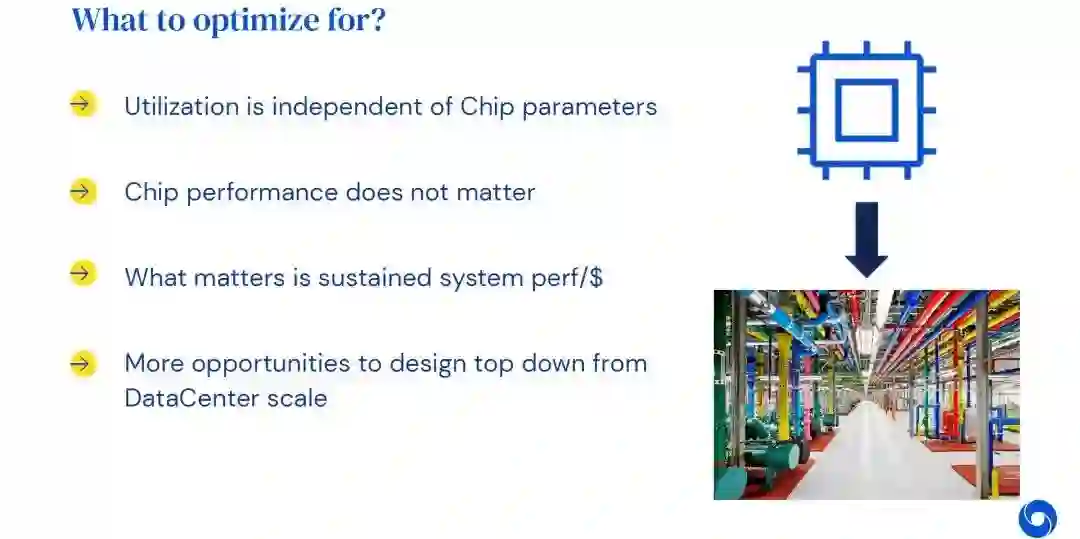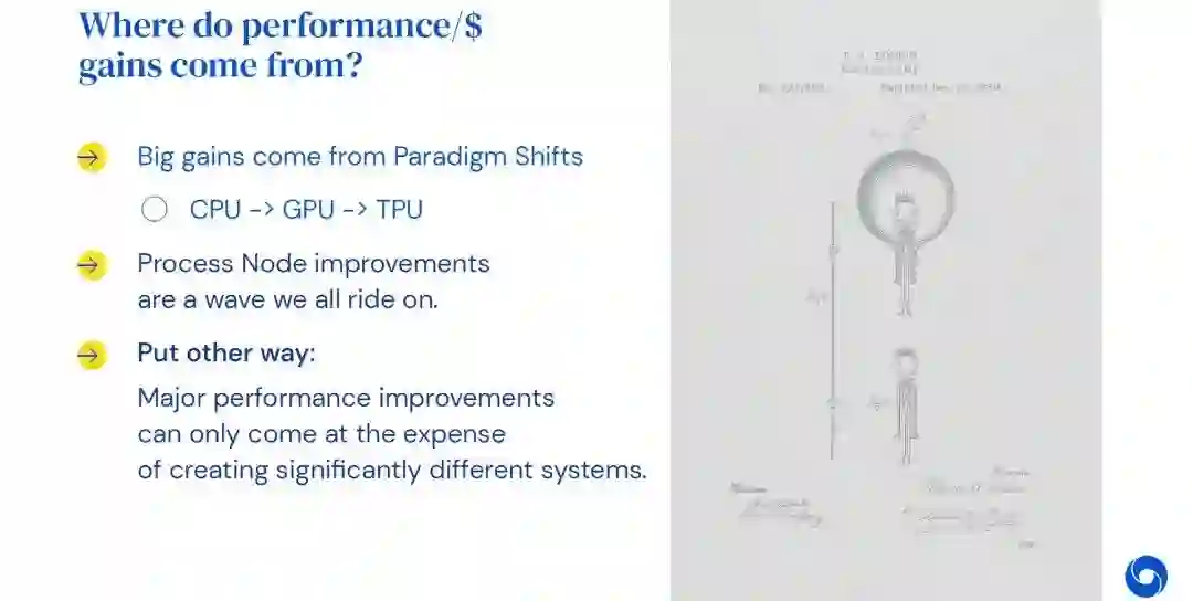 我们还是先从芯片说起。Google的TPU已经开发了好几代了(最新的TPU4已经在MLPerf露了脸,「AI训练芯片巅峰对决,如何正确『围观』?」),今年的Hot Chips上也介绍了架构的演进「Google’s Training Chips Revealed: TPUv2 and TPUv3」(可以参考「Google TPUv2/v3架构及其设计演化」)。 而同样在Hot Chips上,Dan Belov的keynote,「AI Research at Scale - Opportunities on the Road Ahead」,从更宏观的角度分析了未来AI系统和芯片的趋势。 就在一天前,Raja M. Koduri在Hot Chips上介绍了Intel怎么实现到2025年把算力提升1000X,相信很多朋友都看过了,我就不多说了。 source: Intel@Hot Chips 2020 回到Dan Belov的keynote,同样在讲为了支持大规模AI研究,怎样实现1000X的算力提升。结合Google的背景,他很自然的强调系统而非单个芯片的优化,其中有一些观点值得我们思考。 source: DeepMind@Hot Chips 2020 首先是对大规模AI研究任务的总体优化目标的分析。根据他们的观察,优化最好的项目最多能够达到70%的利用率,而平均情况是只能用的峰值算力的20%,而造成这种情况的原因很多,包括硬件限制,比如memory和I/O;软件栈效率问题,比如编译器,python runtime的性能;还有任务本身的问题,比如Startup time,Contention以及Amdahl’s law等等。因此,只看单个设备的峰值效率(perf/$)意义不大,而解决方法是从数据中心规模做自顶向下的系统优化。 当然,我不认同「Chip performance」真的「does not matter」,应该说,除了芯片性能之外,还有很多其它需要优化的地方,或者说有能够优化的机会。source: DeepMind@Hot Chips 2020 从硬件角度来看,两个最重要的机会包括,「Move everything into Si」和「Paradigm Shift」。在第一个方向,我们是否可以期待未来出现Datacenter-on-Chip,Datacenter-on-Wafer或者Datacenter-in-Package?也许Chiplet和Wafer-Scale-Engine能够实现。 进一步看所谓「Paradigm Shift」,它会带来巨大的收益,同样也意味着着我们必须付出巨大的代价,即需要设计「significantly different systems」。由于整个软硬件基础设施的复杂性和不灵活性,要进行「Paradigm Shift」当然不是说说这么简单。source: DeepMind@Hot Chips 2020 同时,硬件的多样性也会带来很大的软件移植开销。 source: DeepMind@Hot Chips 2020当然,好消息是,AI应用本身的特征,在一定程度上简化了问题。到此,其实就是我们这几年面向AI应用优化系统和芯片的一个基本逻辑:应用的需求驱动计算范式的转变,而应用的特征使这种转变成为可能。这后面Dan Belov还给出了一些其它的机会,比如编译技术(MLIR)和把AI用于编译优化等等,感兴趣的朋友可以去看看,我就不赘述了。