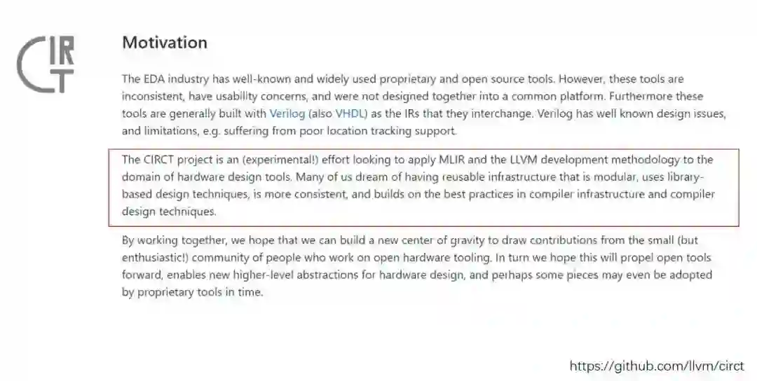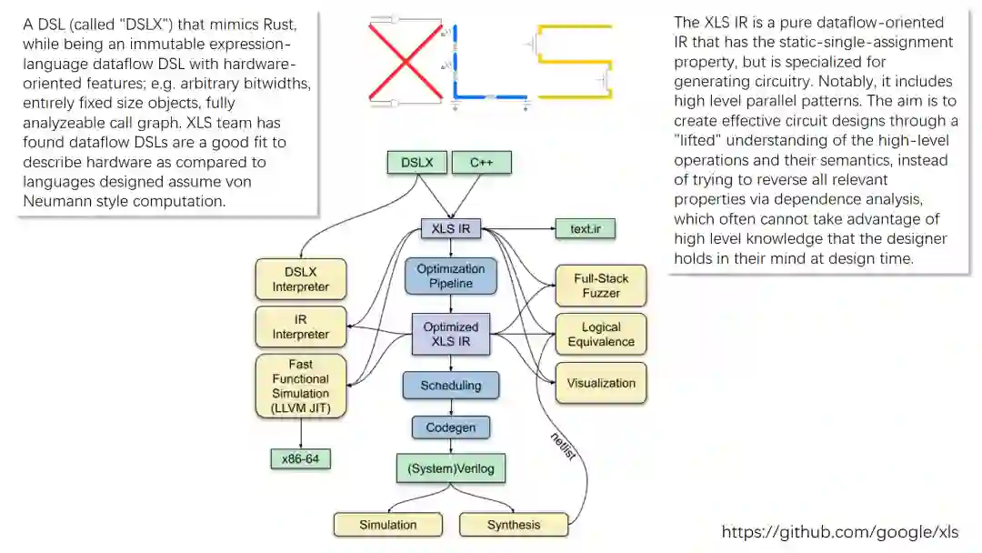 下面要介绍的开源项目CIRCT时间不长,相对也小众很多,不过很有意思,值得关注。 严格的说,这个项目并不是Google主导的项目,但却和Google发起的MLIR项目关系密切,也是MLIR Ecosystem的一部分。大家知道,MLIR是Chris Lattner在Google发起的编译器项目,我在之前的文章中也多次提到。Chris Lattner之后离开了Google,加入SiFive,并对硬件设计产生了极大兴趣,因此发起了CIRCT项目。CIRCT的基本思路就是利用MLIR/LLVM中的编译器技术和基础设施来改进硬件设计语言和工具(特别是开源工具)。 我们知道,EDA工具的目标是产生可生产的芯片设计。一个芯片设计流程,一般从一个DSL(Domain Specific Language),比如System Verilog/VHDL这样的硬件描述语言开始;然后会经过几个抽象层次的变化(类似软件编译的过程);在每个层次需要进行相应的验证,层次间的转换需要进行等价性验证。这个过程中的几个要素:编程语言,编译技术,验证技术,并不是硬件设计独有,很多都是和软件领域相通的。CIRCT这个项目最有趣的地方是软件编译器的开发者开始关注硬件设计工具,而且是从DSL/IR/Compiler这个角度切入,肯定不会只是修修补补的工作。 在进一步讨论CIRCT项目之前,我们先看看另一个Google发起的项目XLS[5],这是一个高层次综合(HLS:High Level Synthesis)项目。HLS是EDA领域中学术研究比较多的内容,其目标是通过提升设计输入的抽象层次来实现算法/应用直接到硬件的自动化设计实现,从而提高芯片开发的效率,我在之前的一篇文章中(在体系结构黄金期,ESL设计方法学能否「焕发青春」?)简单介绍过这个方向。 首先,这个项目自己定义了一个DSL来描述硬件。这里使用了类似Rust语言的DSLX。此外,XLS项目设计了自己的IR和编译工具,验证工具(包括Logic Equivalence),最终生成Verilog语言,进入传统的芯片设计流程。其实,和XLS项目类似的HLS项目在EDA学术界挺多的。 由于HLS的抽象层次高于RTL级的硬件描述,不合适使用Verilog/VHDL来作为DSL的,一般会直接使用描述算法的C/C++这样的语言,但直接使用这些语言也有很多困难,这里就不展开讲了。最近几年,大家比较喜欢参考(或基于)有函数式编程特征的语言(Scala,Rust或者Haskell)来设计DSL,出现各式各样的语言([6]中就有「Golden Age of Hardware Description Languages」的提法)。 这也是吸取软件领域经验的一种方式,但目前还没有一种高层次的DSL能够真正成为主流。顺便提一下,Chisel语言(基于Scala)可能是近几年在硬件设计语言上最成功的尝试,但Chisel还是RTL层次的语言,并不是为HLS任务设计的。 另一个可以参考的学术项目是斯坦福的Agile Hardware Project[7]。其目标是自动化设计面向图像处理的CGRA(Coarse-Grained Reconfigurable Architecture),使用Halide作为DSL,自己定义的CoreIR作为中间表达,并在此基础上建立相应的工具链。 通过XLS和AHA的两个例子,我想强调的是设计一个好的DSL/IR系统对于一个特定领域的EDA任务是至关重要的。而目前的芯片设计工具和方法,主要还是围绕抽象层次比较低的Verilog/VHDL来建立的。除了设计和验证效率低的问题,对于软硬件的联合优化也非常不友好。这个问题并不是什么新问题,十几年前就有很多讨论,但到目前为止并没有太多的变化。 一些尝试,比如SystemC,Bluespec,都不怎么成功。这个现象有很多的原因,其中之一是设计DSL/IR和相应的编译器(包括验证工具)的门槛和成本很高。这有点类似于本文第一部分说的,我们要做面向“新的计算范式”的硬件,其软件栈开发的难度和成本很高。 这就回到我想讨论的CIRCT这个项目的意义:是否可能利用MLIR的多层IR的思想及其提供编译器基础架构来拉低建立一个DSL/IR系统和相应的编译器的成本?从而让我们有可能在芯片设计工具和方法学上做更多的创新。现在CIRCT这个项目还是刚刚开始,很难说能未来发展到什么程度,但它至少让我们看到更多的可能。 参考资料[1] Dan Belov, "AI Research at Scale - Opportunities on the Road Ahead", Hot Chips 2020[2] Jeff Dean, "The Deep Learning Revolution and Its Implications for Computer Architecture and Chip Design", ISSCC 2020[3] Azalia Mirhoseini, Anna Goldie, "Reinforcement Learning for Placement Optimization", Design Automation WebiNar (DAWN), https://duke-cei-lab.github.io/DAWN/event1[4] "CIRCT" / Circuit IR Compilers and Tools", https://github.com/llvm/circt[5] "XLS: Accelerated HW Synthesis", https://github.com/google/xls[6] Lenny Truong, Pat Hanrahan, "A Golden Age of Hardware Description Languages: Applying Programming Language Techniques to Improve Design Productivity", SNAPL 2019[7] "Stanford AHA! Agile Hardware Center",https://aha.stanford.edu/ AI Chip Listhttps://basicmi.github.io/AI-Chip/AI Chip Paper Listhttps://github.com/BirenResearch/AIChip_Paper_List
