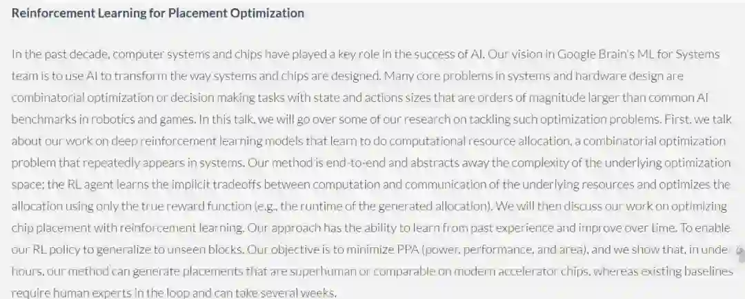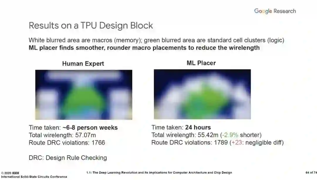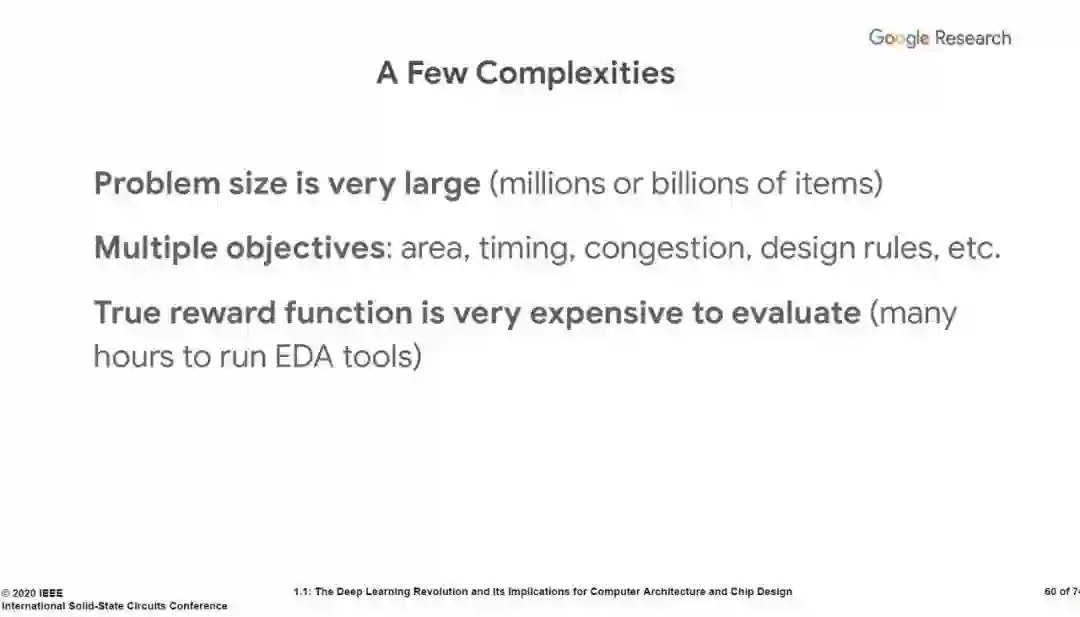 我这几年一直有一个观点,就是AI芯片的热潮带来很多side effect,大大促进的相关技术和产业的发展。Google在做TPU的过程中,除了芯片和软件栈(XLA/MLIR等等)的探索,也涉及到了芯片设计工具和方法学。 首先是一个大家可能都听过的新闻:「Google用AI设计芯片」。当然,这个说法有很多夸大的成分,这项工作更准确的说法是「Reinforcement Learning for Placement Optimization」,即用增强学习的方法进行布局(芯片设计流程中的后端设计的一个任务)优化。Jeff Dean在今年的ISSCC专门介绍了这项工作。 source: Jeff Dean@ISSCC 2020 关心更详细信息的朋友可以去看看[3],有这个项目的开发者的讲解和相关讨论。 source: Azalia Mirhoseini and Anna Goldie @DAWN event1 作者Azalia Mirhoseini之前就尝试用增强学习来优化计算系统里的任务分配(Hierarchical Planning for Device Placement),我在之前的文章(ML + System = ?)中也提到过。这项工作本身只是解决芯片后端布局布线中的一个问题,并不像宣传的那么夸张。 但这个工作是近几年「把AI用于EDA」这个大愿景里面的一个比较成功的例子,再加上Google的背景,所以受到很大关注。我还记得之前在一个EDA学者群里,对这项工作有过很热烈的讨论。当然,不管大家怎么评价,Google应该还是会继续探索下去。毕竟Jeff Dean已经说了「Anywhere We're Using Heuristics To Make a Decision」都是机器学习的用武之地。 第二个可能会对芯片和EDA产业产生更深远影响的是Google所作的Cloud EDA尝试,这个我之前做过一个简单的分析,「为云而生又生于云中的芯片给我们的启示」。这中间的一个核心实践是利用cloud上近乎「无限」的资源进行芯片验证,可以大大加速芯片开发的时间,这可能也是TPU系列芯片能够相对快速迭代的原因之一。Cloud EDA最近的关注度也很高,下面这张slide,介绍它的优势,来自Chips Alliance最近的一个workshop。source: Dan Ganousis, Metrics@CHIP Alliance workshop 最近,我的一个在EDA公司工作了十多年的前同事加入Google Cloud,做相关工作,这可能也是Google的系统性优势的一点体现吧。总之,在Cloud EDA方向,Google的推动值得关注。 除了Cloud商业项目,Google还非常积极的参与了开源EDA的工作,是CHIP Alliance的发起者。相信大家都关注到Google和Skywater的开源PDK项目,以及Google支持的免费投片。此外还有例如RISCV-DV的开源项目,有兴趣的读者可以看看最近的Chip Alliance Workshop。source: CHIPS Alliance Workshop - September 17, 2020
