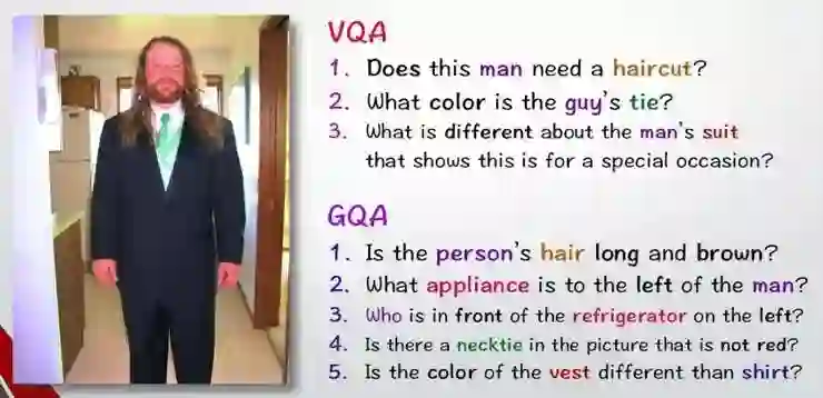 GQA 数据集的许多问题涉及多种推理技巧、空间理解以及多步推理,比起人们先前常用的视觉回答数据集,更具有挑战性。他们保证了数据集的平衡性,严格控制不同问题组的答案分布,以防止人们通过语言和世界先验知识进行有据猜测。